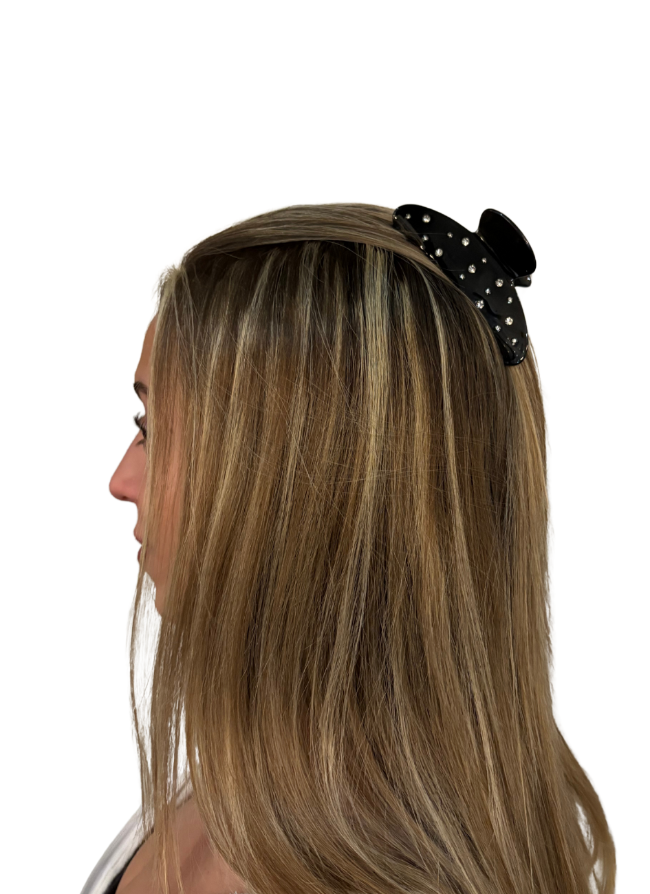 a bold, glossy black claw clip dusted in sparkling rhinestones, designed to elevate your everyday glam. Oversized for effortless hold and crafted to shine from every angle, she’s the perfect blend of sleek, sophisticated, and statement-making.